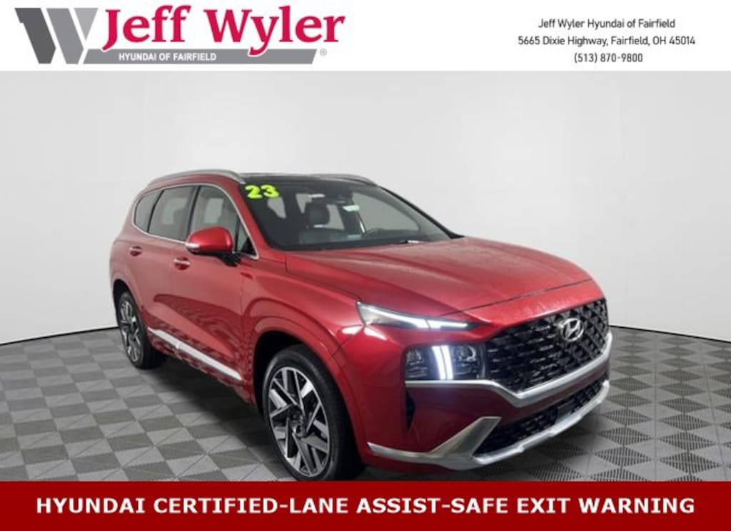 CARFAX One-Owner. Clean CARFAX. Jeff Wyler Hyundai of Fairfield is excited to offer this great-looking 2023 Hyundai Santa Fe Calligraphy in Calypso Red. Well equipped with: Option Group 01, Hyundai Certified Used Vehicles Certified, Black Leather, Android Auto, Apple CarPlay, CALL NOW FOR YOUR VIP APPOINTMENT 513-870-9800, FULLY SERVICED w/RECORDS, GUARANTEED FINANCING!! NO MATTER YOUR SITUATION WE CAN GET AN APPROVAL!!, THE #1 Volume dealer in the region! Come see why for yourself Today!!, WE PAY MORE FOR YOUR TRADE!!, 12 Speakers, 4-Wheel Disc Brakes, ABS brakes, Air Conditioning, All Season Fitted Liners, Alloy wheels, AM/FM radio: SiriusXM, Apple CarPlay & Android Auto, Auto High-beam Headlights, Auto-dimming Rear-View mirror, Automatic temperature control, Axle Ratio: 3.316, Brake assist, Bumper Applique, Bumpers: body-color, Cargo Net, Cargo Tray, Delay-off headlights, Driver door bin, Driver vanity mirror, Dual front impact airbags, Dual front side impact airbags, Electronic Stability Control, Emergency communication system, Exterior Parking Camera Rear, Four wheel independent suspension, Front anti-roll bar, Front Bucket Seats, Front Center Armrest, Front dual zone A/C, Front reading lights, Fully automatic headlights, Garage door transmitter: HomeLink, harman/kardon® Speakers, Heads-Up Display, Heated & Ventilated Front Bucket Seats, Heated door mirrors, Heated front seats, Heated rear seats, Heated steering wheel, Illuminated entry, Leather steering wheel, Low tire pressure warning, Memory seat, Mudguards, Navigation System, Occupant sensing airbag, Outside temperature display, Overhead airbag, Overhead console, Panic alarm, Passenger door bin, Passenger vanity mirror, Power door mirrors, Power driver seat, Power Liftgate, Power moonroof, Power passenger seat, Power steering, Power windows, Quilted Premium Nappa Leather Seat Trim, Radio: AM/FM Harman Kardon Display Audio, Rain sensing wipers, Rear anti-roll bar, Rear seat center armrest, Rear window defroster, Rear window wiper, Remote keyless entry, Security system, Speed control, Speed-sensing steering, Split folding rear seat, Spoiler, Steering wheel mounted audio controls, Tachometer, Telescoping steering wheel, Tilt steering wheel, Traction control, Trip computer, Turn signal indicator mirrors, Variably intermittent wipers, Ventilated front seats, and Wheels: 20" x 8.0J Alloy. Certified. Hyundai Certified Used Vehicles Details: * Includes 10-year/Unlimited Mileage Roadside Assistance with Rental Car and Trip Interruption Reimbursement; Please See Dealers for Specific Vehicle Eligibility Requirements. 10-Year/100,000 Mile Hybrid/EV Battery Warranty. 3-Months SiriusXM Trial Subscription. Complimentary 1 Year (Connected Care & Remote Pkgs). * Warranty Deductible: $50 * 173+ Point Inspection * Vehicle History * Powertrain Limited Warranty: 120 Month/100,000 Mile (whichever comes first) from original in-service date * Limited Warranty: 60 Month/60,000 Mile (whichever comes first) from original in-service date * Roadside AssistanceTO CHECK ON THE AVAILABILITY OF THIS VEHICLE REACH OUT TO ONE OF OUR TEAM MEMBERS!! ALSO SHOP ONLINE AT https://www.jeffwylerhyundaioffairfield.com/ Proudly Serving: Cincinnati, Dayton, Columbus, Louisville, Lexington, Indianapolis, Hamilton, Florence, Alexandria, Beavercreek, Springdale, West Chester, Monroe, Fairfield, Kenwood, Newport and all of greater Cincinnati Ohio, Indiana, and Northern Kentucky.