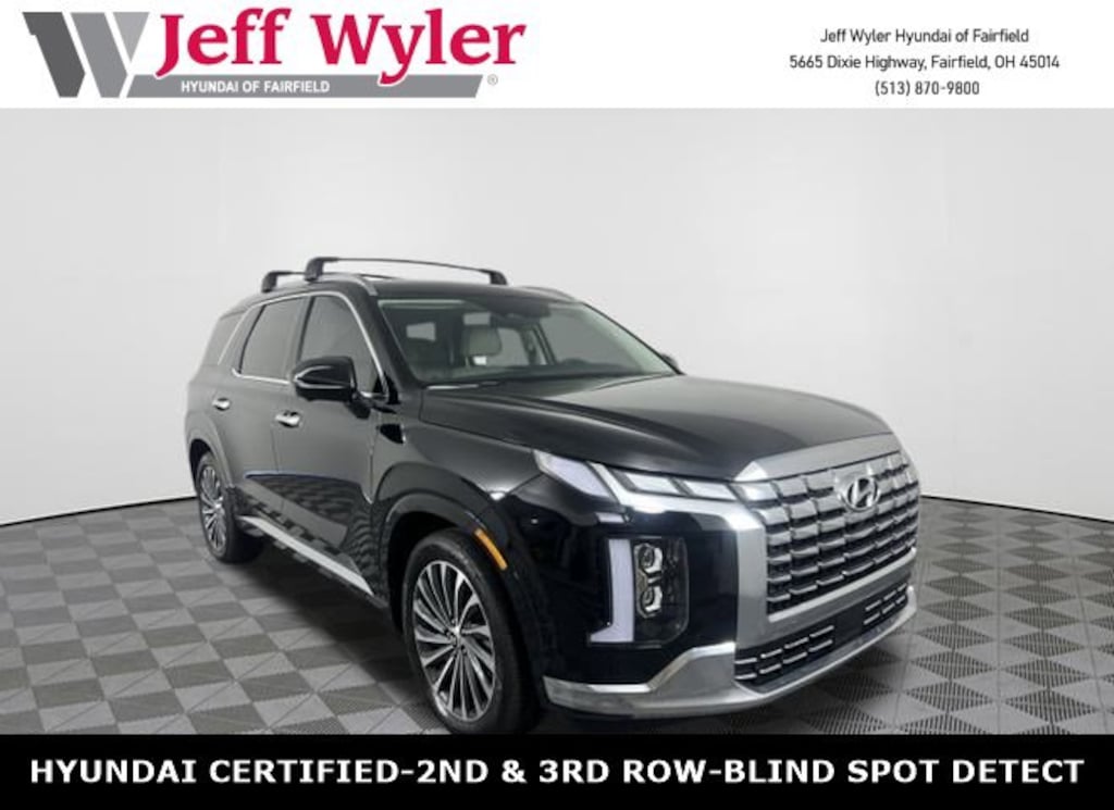 CARFAX One-Owner. Jeff Wyler Hyundai of Fairfield is proud to offer this beautiful-looking 2024 Hyundai Palisade Calligraphy in Abyss Black Pearl. Well equipped with: Option Group 01, Hyundai Certified Used Vehicles Certified, Android Auto, Apple CarPlay, CALL NOW FOR YOUR VIP APPOINTMENT 513-870-9800, FULLY SERVICED w/RECORDS, GUARANTEED FINANCING!! NO MATTER YOUR SITUATION WE CAN GET AN APPROVAL!!, THE #1 Volume dealer in the region! Come see why for yourself Today!!, WE PAY MORE FOR YOUR TRADE!!, 12 Speakers, 3.648 Axle Ratio, 3rd row seats: split-bench, 4-Wheel Disc Brakes, ABS brakes, Air Conditioning, Alloy wheels, AM/FM radio: SiriusXM, Apple CarPlay & Android Auto, Auto High-beam Headlights, Auto-dimming door mirrors, Auto-dimming Rear-View mirror, Auto-leveling suspension, Automatic temperature control, Brake assist, Bumper Applique, Bumpers: body-color, Cargo Net, Carpeted Floor Mats, Compass, Delay-off headlights, Driver door bin, Driver vanity mirror, Dual front impact airbags, Dual front side impact airbags, Electronic Stability Control, Emergency communication system, Exterior Parking Camera Rear, Four wheel independent suspension, Front anti-roll bar, Front Bucket Seats, Front Center Armrest, Front dual zone A/C, Front reading lights, Fully automatic headlights, Garage door transmitter: HomeLink, harman/kardon® Speakers, Heads-Up Display, Heated & Ventilated Front Bucket Seats, Heated door mirrors, Heated front seats, Heated rear seats, Heated steering wheel, Illuminated entry, Knee airbag, Low tire pressure warning, Memory seat, Mudguards, Navigation System, Occupant sensing airbag, Outside temperature display, Overhead airbag, Overhead console, Panic alarm, Passenger door bin, Passenger vanity mirror, Power door mirrors, Power driver seat, Power Liftgate, Power moonroof, Power passenger seat, Power steering, Power windows, Premium Nappa Leather Seat Trim, Radio data system, Radio: AM/FM/MP3 Premium Audio System, Rain sensing wipers, Rear air conditioning, Rear anti-roll bar, Rear audio controls, Rear reading lights, Rear side impact airbag, Rear window defroster, Rear window wiper, Reclining 3rd row seat, Remote keyless entry, Roadside Assistance Kit, Roof Rack Cross Rails, Security system, Speed control, Speed-sensing steering, Split folding rear seat, Spoiler, Steering wheel mounted audio controls, Tachometer, Telescoping steering wheel, Tilt steering wheel, Traction control, Trip computer, Turn signal indicator mirrors, Variably intermittent wipers, Ventilated front seats, Ventilated rear seats, and Wheels: 20" x 7.5J Calligraphy Exclusive Alloy. Certified. Hyundai Certified Used Vehicles Details: * 173+ Point Inspection * Roadside Assistance * Includes 10-year/Unlimited Mileage Roadside Assistance with Rental Car and Trip Interruption Reimbursement; Please See Dealers for Specific Vehicle Eligibility Requirements. 10-Year/100,000 Mile Hybrid/EV Battery Warranty. 3-Months SiriusXM Trial Subscription. Complimentary 1 Year (Connected Care & Remote Pkgs). * Limited Warranty: 60 Month/60,000 Mile (whichever comes first) from original in-service date * Powertrain Limited Warranty: 120 Month/100,000 Mile (whichever comes first) from original in-service date * Warranty Deductible: $50 * Vehicle HistoryTO CHECK ON THE AVAILABILITY OF THIS VEHICLE REACH OUT TO ONE OF OUR TEAM MEMBERS!! ALSO SHOP ONLINE AT https://www.jeffwylerhyundaioffairfield.com/ Proudly Serving: Cincinnati, Dayton, Columbus, Louisville, Lexington, Indianapolis, Hamilton, Florence, Alexandria, Beavercreek, Springdale, West Chester, Monroe, Fairfield, Kenwood, Newport and all of greater Cincinnati Ohio, Indiana, and Northern Kentucky.