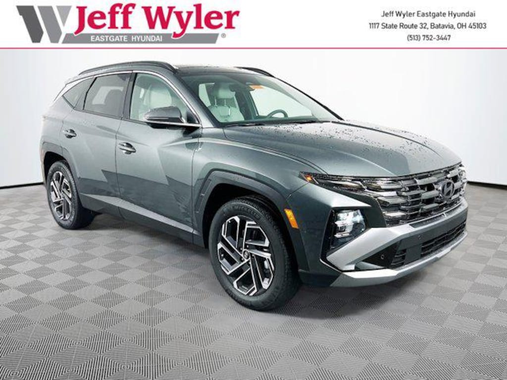 Amazon Gray 2026 Hyundai Tucson Hybrid Limited 1.6L I4 DGI Hybrid Turbocharged DOHC 16V LEV3-SULEV30 AWD 6-Speed Automatic 37/36 City/Highway MPG Jeff Wyler Eastgate Auto Mall is delighted to offer this attractive 2026 Hyundai Tucson Hybrid Limited in Amazon Gray. Well equipped with: Option Group 01, 4-Wheel Disc Brakes, 8 Speakers, ABS brakes, Air Conditioning, Alloy wheels, AM/FM radio: SiriusXM, Apple CarPlay & Android Auto, Auto High-beam Headlights, Auto-dimming Rear-View mirror, Automatic temperature control, Brake assist, Bumpers: body-color, Cargo Cover, Cargo Net, Cargo Tray, Carpeted Floor Mats, Delay-off headlights, Driver door bin, Driver vanity mirror, Dual front impact airbags, Dual front side impact airbags, Electronic Stability Control, Emergency communication system: Bluelink+, First Aid Kit, Four wheel independent suspension, Front anti-roll bar, Front Bucket Seats, Front Center Armrest, Front dual zone A/C, Front reading lights, Fully automatic headlights, Garage door transmitter: HomeLink, Heads-Up Display, Heated & Ventilated Front Bucket Seats, Heated door mirrors, Heated front seats, Heated rear seats, Heated steering wheel, Illuminated entry, Leather steering wheel, Leather-Trimmed Seat Trim, Low tire pressure warning, Memory seat, Navigation System, Occupant sensing airbag, Outside temperature display, Overhead airbag, Overhead console, Panic alarm, Passenger door bin, Passenger vanity mirror, Power door mirrors, Power driver seat, Power Liftgate, Power moonroof, Power passenger seat, Power steering, Power windows, Radio data system, Radio: Bose Premium w/AM/FM/HD Audio System, Rain sensing wipers, Rear anti-roll bar, Rear reading lights, Rear seat center armrest, Rear side impact airbag, Rear window defroster, Rear window wiper, Remote keyless entry, Roadside Assistance Kit, Roof Rack Cross Rails, Security system, Speed control, Split folding rear seat, Spoiler, Steering wheel mounted audio controls, Tachometer, Telescoping steering wheel, Tilt steering wheel, Traction control, Trip computer, Turn signal indicator mirrors, Variably intermittent wipers, Ventilated front seats, and Wheels: 19" x 7.5J Alloy. 37/36 City/Highway MPG