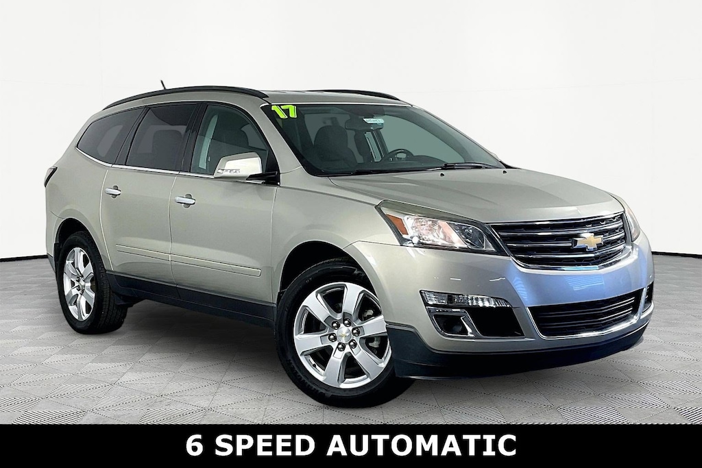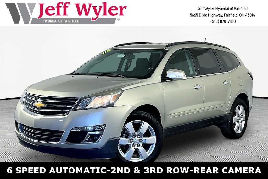 Jeff Wyler Hyundai of Fairfield is pumped up to offer this good-looking 2017 Chevrolet Traverse LT in Champagne Silver Metallic. Well equipped with: Front License Plate Bracket Mounting Package, Preferred Equipment Group 1LT (8-Way Power Driver Seat w/Power Lumbar, Bluetooth® For Phone, Body-Color Bodyside Moldings, Body-Color Heated Power-Adjustable Outside Mirrors, Enhanced Driver Information Center, Front Fog Lamps, Frontal & Side-Impact Airbags, Interior Wood Grain Center Stack & Interior Trim, Leather-Wrapped Steering Wheel, Rear Park Assist, Remote Vehicle Start, and Standard Speaker System), Style & Technology Package (Heated Driver & Front Passenger Seats, Radio: Chevrolet MyLink AM/FM Stereo w/CD Player, SiriusXM Satellite Radio, Universal Home Remote, Variable Effort Power Steering, and Wheels: 20" x 7.5" Painted Aluminum (4)), Android Auto, Apple CarPlay, CALL NOW FOR YOUR VIP APPOINTMENT 513-870-9800, FULLY SERVICED w/RECORDS, GUARANTEED FINANCING!! NO MATTER YOUR SITUATION WE CAN GET AN APPROVAL!!, THE #1 Volume dealer in the region! Come see why for yourself Today!!, WE PAY MORE FOR YOUR TRADE!!, 18" x 7.5" Machined Aluminum Wheels, 3.16 Axle Ratio, 3rd row seats: split-bench, 4-Wheel Disc Brakes, 6 Speakers, 8-Passenger Seating (2-3-3 Seating Configuration), ABS brakes, Air Conditioning, Alloy wheels, AM/FM radio: SiriusXM, Bodyside moldings, Brake assist, Bumpers: body-color, CD player, Compass, Delay-off headlights, Driver door bin, Driver vanity mirror, Dual front impact airbags, Dual front side impact airbags, Electronic Stability Control, Emergency communication system, Exterior Parking Camera Rear, Four wheel independent suspension, Front anti-roll bar, Front Bucket Seats, Front Center Armrest w/Storage, Front fog lights, Front reading lights, Fully automatic headlights, Heated door mirrors, Illuminated entry, Low tire pressure warning, Occupant sensing airbag, Outside temperature display, Overhead airbag, Panic alarm, Passenger door bin, Passenger vanity mirror, Power door mirrors, Power driver seat, Power steering, Power windows, Premium Cloth Seat Trim, Radio data system, Radio: Color Touch AM/FM/SiriusXM/CD Player, Rear air conditioning, Rear anti-roll bar, Rear reading lights, Rear seat center armrest, Rear window defroster, Rear window wiper, Remote keyless entry, Roof rack: rails only, Security system, Speed control, Split folding rear seat, Spoiler, Steering wheel mounted audio controls, Tachometer, Telescoping steering wheel, Tilt steering wheel, Traction control, Trip computer, Turn signal indicator mirrors, Variably intermittent wipers, and Voltmeter. Reviews: * Smooth ride even when the road isn't; can accommodate up to eight passengers; plenty of cargo space behind the third row; peace of mind that comes with top safety scores. Source: EdmundsTO CHECK ON THE AVAILABILITY OF THIS VEHICLE REACH OUT TO ONE OF OUR TEAM MEMBERS!! ALSO SHOP ONLINE AT https://www.jeffwylerhyundaioffairfield.com/ Proudly Serving: Cincinnati, Dayton, Columbus, Louisville, Lexington, Indianapolis, Hamilton, Florence, Alexandria, Beavercreek, Springdale, West Chester, Monroe, Fairfield, Kenwood, Newport and all of greater Cincinnati Ohio, Indiana, and Northern Kentucky.