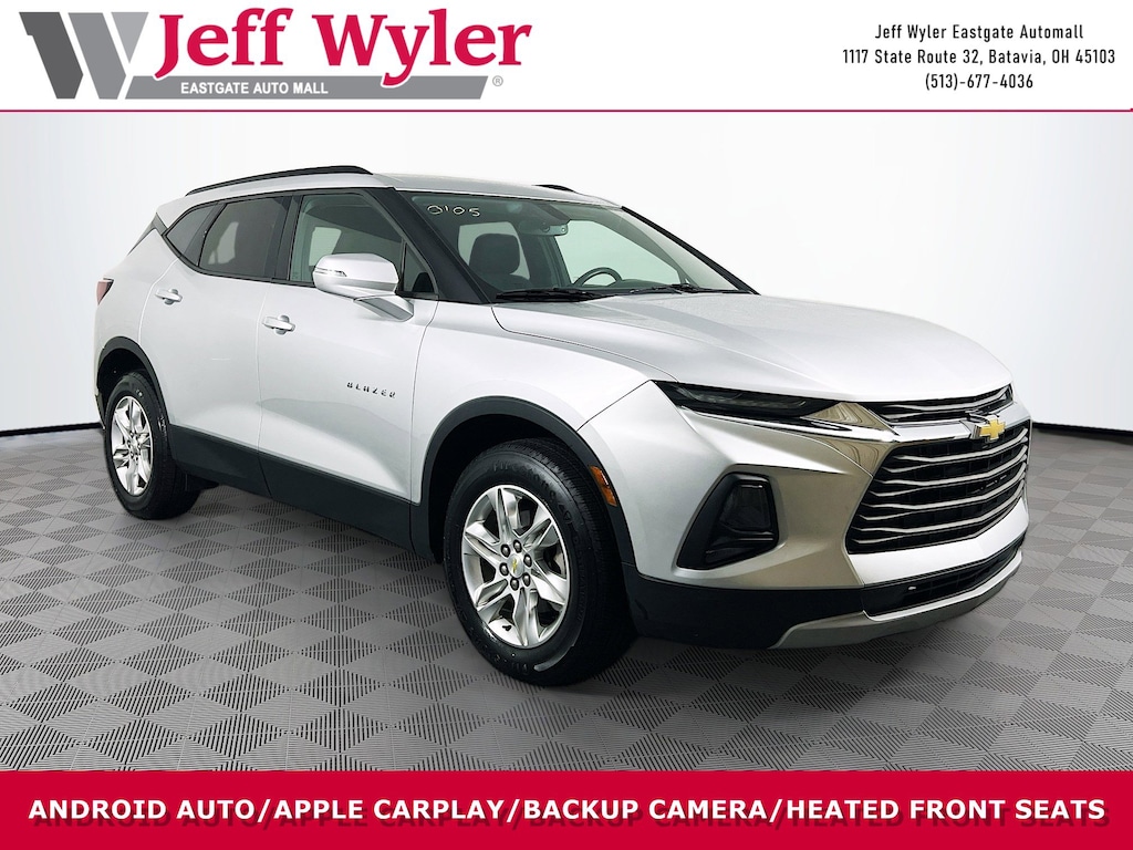 Jeff Wyler Eastgate Auto Mall is honored to offer this gorgeous 2019 Chevrolet Blazer in Silver Ice Metallic. Well equipped with: Convenience & Driver Confidence Package (Black Roof Rails, Heated Driver & Front Passenger Seats, Inside Rear-View Auto-Dimming Mirror, Lane Change Alert w/Side Blind Zone Alert, Outside Heated Power-Adjustable Body-Color Mirrors, Rear Cross Traffic Alert, Rear Park Assist w/Audible Warning, Rear Power Programmable Liftgate, Remote Vehicle Starter System, and Universal Home Remote), Floor Liner Package (LPO) (1st & 2nd Row All-Weather Floor Liner (LPO) and Integrated Cargo Liner (LPO)), Preferred Equipment Group 1LT, 3.80 Final Drive Ratio, 4-Wheel Disc Brakes, 6 Speakers, 6-Speaker Audio System Feature, ABS brakes, Air Conditioning, Alloy wheels, AM/FM radio: SiriusXM, Apple CarPlay/Android Auto, Automatic temperature control, Brake assist, Bumpers: body-color, Child-Seat-Sensing Airbag, Compass, Delay-off headlights, Driver door bin, Driver vanity mirror, Dual front impact airbags, Dual front side impact airbags, Electronic Stability Control, Emergency communication system: OnStar and Chevrolet connected services capable, Four wheel independent suspension, Front anti-roll bar, Front Bucket Seats, Front Center Armrest, Front dual zone A/C, Front reading lights, Fully automatic headlights, Heated door mirrors, High-Intensity Discharge Headlights, Illuminated entry, Knee airbag, Leather Shift Knob, Low tire pressure warning, Occupant sensing airbag, Outside temperature display, Overhead airbag, Overhead console, Panic alarm, Passenger door bin, Passenger vanity mirror, Power door mirrors, Power driver seat, Power steering, Power windows, Premium Cloth Seat Trim, Radio data system, Radio: Chevrolet Infotainment 3 System, Rear anti-roll bar, Rear reading lights, Rear seat center armrest, Rear window defroster, Rear window wiper, Remote keyless entry, Ride & Handling Suspension, Security system, Speed control, Speed-sensing steering, Split folding rear seat, Spoiler, Steering wheel mounted audio controls, Tachometer, Telescoping steering wheel, Tilt steering wheel, Traction control, Trip computer, Variably intermittent wipers, Voltmeter, and Wheels: 18" Bright Silver Aluminum. Clean CARFAX. Awards: * JD Power Automotive Performance, Execution and Layout (APEAL) Study Ask about available certifications. Used vehicles 10 years of age or newer with less than 100,000 miles are eligible for the Wyler Assurance Program, but eligible vehicles must pass our reconditioning process and multi-point inspection. Provided the vehicle passes inspection, vehicles will be eligible for the 6 month/6,000 mile limited warranty. The 6 month/6,000 mile limited warranty is NOT available on AS-IS vehicles, wholesale vehicles, lease buyback/pass-thru vehicles or un-inspected vehicles. Note that this program can also apply to vehicles where the remaining factory coverage is less than 6 months or 6,000 miles. Please check the Federal Trade Commission (FTC) Buyers guide on the vehicle for full details as to whether or not warranty coverage may apply. Contact Dealer for additional details. The Wyler Assurance 6 month/6,000 Mile limited warranty ends 6 months from the date of the Retail Purchase Agreement (BUYERS ORDER) or when the vehicle's odometer registers 6,000 additional miles to the mileage listed on the BUYERS ORDER, whichever comes first. Your Deductible - The warranty holder on your contract pays the first $100 of each covered repair.
