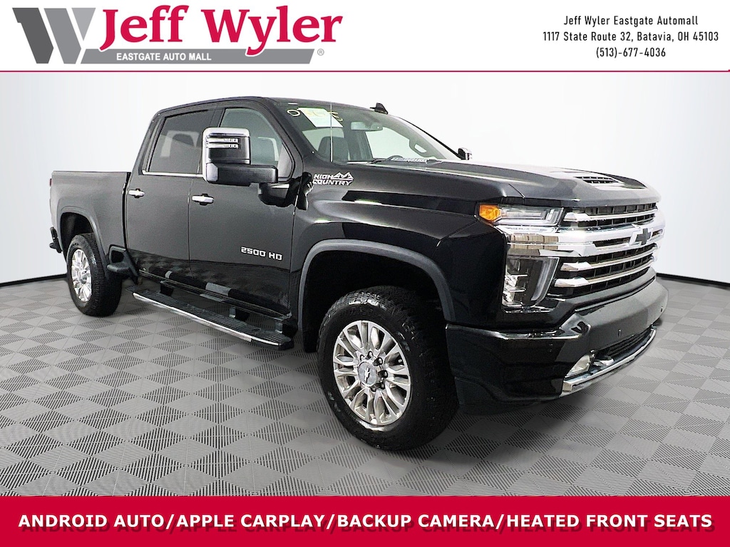 Jeff Wyler Eastgate Auto Mall is pumped up to offer this handsome 2022 Chevrolet Silverado 2500HD High Country in Black. Well equipped with: Gooseneck/5th Wheel Prep Package, Preferred Equipment Group 3LZ (12-Volt Rear Auxiliary Power Outlet, 120-Volt Bed Mounted Power Outlet, 120-Volt Instrument Panel Power Outlet, 170 Amp Alternator, 6" Rectangular Chromed Tubular Assist Steps, 8" Driver Information Center, Advanced Trailering System, Auto-Dimming Inside Rear-View Mirror, Bed View Camera w/2 Trailer Camera Provisions, Black Chevytec Spray-On Bedliner w/Chevrolet Logo, Bluetooth® For Phone, Chevrolet Connected Access Capable, Chrome Front Grille, Chrome Mirror Caps, Color-Keyed Carpeting Floor Covering, Compass, Deep-Tinted Glass, Dual Charge-Only USB Ports (2nd Row), Electric Rear-Window Defogger, Electrical Lock Control Steering Column, Electronic Cruise Control w/Set & Resume Speed, Front Carpeted Floor Mats, Front Chrome Recovery Hooks, Front LED Fog Lamps, HD Surround Vision w/2 Trailer View Camera Provisions, Heated & Auto-Dim Pwr Vertical Trailering Mirrors, Heated Steering Wheel, Hitch Guidance w/Hitch View, Integrated Trailer Brake Controller, Keyless Open & Start, Lane Change Alert w/Side Blind Zone Alert, Leather-Wrapped Steering Wheel, LED Cargo Area Lighting, Manual Tilt & Telescoping Steering Column, OnStar & Chevrolet Connected Services Capable, Polished Exhaust Tip, Power Door Locks, Power Front Windows w/Driver Express Up/Down, Power Front Windows w/Passenger Express Up/Down, Power Rear Windows w/Express Down, Power Sliding Rear Window w/Defogger, Rear Carpeted Floor Mats, Rear Cross Traffic Alert, Rear Wheelhouse Liners, Remote Vehicle Starter System, SiriusXM w/360L, Standard Tailgate, Steering Wheel Audio Controls, Ultrasonic Front & Rear Park Assist, Unauthorized Entry Theft-Deterrent System, Universal Home Remote, Wi-Fi Hotspot Capable, Wireless Charging, and Wireless Phone Projection), Snow Plow Prep/Camper Package (220 Amp Alternator), Suspension Package, Up-Level Rear Seat w/Storage Package, Z71 Off-Road Package (Hill Descent Control), 10-Way Power Driver Seat Adjuster w/Lumbar, 10-Way Power Passenger Seat Adjuster w/Lumbar, 4-Wheel Disc Brakes, 7 Speakers, 720 Cold-Cranking Amps Heavy-Duty Battery, ABS brakes, Air Conditioning, Alloy wheels, AM/FM radio: SiriusXM with 360L, Auto-dimming door mirrors, Auto-dimming Rear-View mirror, Automatic temperature control, BOSE Premium 7-Speaker Sound System, Brake assist, Bumpers: body-color, Delay-off headlights, Driver door bin, Driver Memory, Driver vanity mirror, Dual front impact airbags, Dual front side impact airbags, Electronic Stability Control, Engine Block Heater, Exhaust Brake, Exterior Parking Camera Rear, Floor-Mounted Center Console, Front anti-roll bar, Front Bucket Seats, Front Center Armrest, Front dual zone A/C, Front fog lights, Front reading lights, Front wheel independent suspension, Fully automatic headlights, Garage door transmitter, Heated 2nd Row Outboard Seats, Heated door mirrors, Heated Driver & Front Outboard Passenger Seating, Heated front seats, Heated steering wheel, Illuminated entry, Low tire pressure warning, Memory seat, Navigation System, Not Equipped w/Front & Rear Park Assist, Occupant sensing airbag, Outside temperature display, Overhead airbag, Overhead console, Panic alarm, Passenger door bin, Passenger vanity mirror, Perforated Leather-Appointed Seat Trim, Power door mirrors, Power driver seat, Power passenger seat, Power steering, Power windows, Premium audio system: Chevrolet Infotainment 3 Premium, Radio: Chevrolet Infotainment 3 Premium System, Rear reading lights, Rear seat center armrest, Rear step bumper, Rear window defroster, Remote keyless entry, Security system, Speed control, Speed-sensing steering, Split folding rear seat, Steering wheel mounted audio controls, Tachometer, Telescoping steering wheel, Tilt steering wheel, Traction control, Trip computer, Turn signal indicator mirrors, Variably intermitten