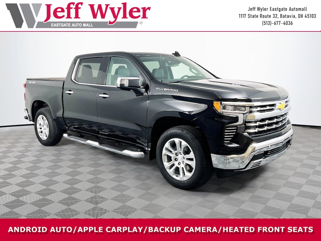 Jeff Wyler Eastgate Auto Mall is pleased to offer this wonderful-looking 2023 Chevrolet Silverado 1500 LTZ in Black. Well equipped with: High Capacity Suspension Package, LTZ Convenience Package (2 USB Data Ports, Floor Mounted Center Console, Power Tilt & Telescoping Steering Column, Premium Bose 7-Speaker Sound System, Ventilated Driver & Front Passenger Seats, and Wireless Charging), LTZ Plus Package, Preferred Equipment Group 1LZ (10-Way Power Driver Seat w/Lumbar, 10-Way Power Passenger Seat Adjuster w/Lumbar, 12.3" Multicolor Reconfigurable Digital Display, 120-Volt Bed Mounted Power Outlet, 120-Volt Instrument Panel Power Outlet, Auto-Dimming Inside Rear-View Mirror, Auto-Locking Rear Differential, Bluetooth® For Phone, Chevrolet Connected Access Capable, Chrome Mirror Caps, Color-Keyed Carpeting Floor Covering, Compass, Deep-Tinted Glass, Driver Memory, Dual Rear USB Ports (Charge Only), Electric Rear-Window Defogger, Electrical Steering Column Lock, Electronic Cruise Control, Front Frame-Mounted Black Recovery Hooks, Front LED Fog Lamps, Front Rainsensing Wipers, Front Rubberized Vinyl Floor Mats, Heated Driver & Front Outboard Passenger Seats, Heated Steering Wheel, Hitch Guidance w/Hitch View, Integrated Trailer Brake Controller, Keyless Open & Start, LED Cargo Area Lighting, OnStar & Chevrolet Connected Services Capable, Outside Heated Power-Adjustable Mirrors, Power Front Passenger Windows w/Express Up/Down, Power Front Windows w/Driver Express Up/Down, Power Rear Windows w/Express Down, Power Tailgate, Rear Rubberized-Vinyl Floor Mats, Rear Wheelhouse Liners, Remote Vehicle Starter System, SiriusXM w/360L, Standard Tailgate, Steering Wheel Audio Controls, Theft Deterrent System (Unauthorized Entry), Trailering App, Wi-Fi Hot Spot Capable, Wireless Phone Projection, and Wrapped Steering Wheel), Safety Package (HD Surround Vision, Perimeter Lighting, Rear Cross Traffic Alert-Braking, Rear Pedestrian Alert, Safety Alert Seat, Trailer Camera Provisions, Trailer Side Blind Zone Alert, and Ultrasonic Front & Rear Park Assist), Trailering Package (Hitch Guidance), Up-Level Rear Seat w/Storage Package, 170 Amp Alternator, 3.23 Rear Axle Ratio, 4-Wheel Disc Brakes, 7 Speakers, ABS brakes, Air Conditioning, Alloy wheels, AM/FM radio: SiriusXM with 360L, Apple CarPlay/Android Auto, Auto High-beam Headlights, Auto-dimming door mirrors, Auto-dimming Rear-View mirror, Automatic Emergency Braking, Automatic temperature control, Brake assist, Bumpers: chrome, Delay-off headlights, Driver door bin, Driver vanity mirror, Dual Exhaust w/Polished Outlets, Dual front impact airbags, Dual front side impact airbags, Electronic Stability Control, Electronic Transmission Range Selector Shifter, Following Distance Indicator, Forward Collision Alert, Front anti-roll bar, Front Bucket Seats, Front Center Armrest, Front dual zone A/C, Front fog lights, Front Pedestrian Braking, Front reading lights, Front wheel independent suspension, Fully automatic headlights, Heated door mirrors, Heated front seats, Heated steering wheel, Illuminated entry, IntelliBeam Automatic High Beam On/Off, Lane Keep Assist w/Lane Departure Warning, Low tire pressure warning, Memory seat, Not Equipped w/Steering Column Lock, Occupant sensing airbag, Outside temperature display, Overhead airbag, Overhead console, Panic alarm, Passenger door bin, Passenger vanity mirror, Perforated Leather-Appointed Front Seat Trim, Power door mirrors, Power driver seat, Power passenger seat, Power steering, Power windows, Premium audio system: Chevrolet Infotainment 3 Premium, Radio data system, Radio: Chevrolet Infotainment 3 Premium System, Rain sensing wipers, Rear reading lights, Rear seat center armrest, Rear step bumper, Rear window defroster, Remote keyless entry, Security system, Speed control, Speed-sensing steering, Split folding rear seat, Steering wheel mounted audio controls, Tachometer, Telescoping steering wheel, Tilt steering wheel, Traction control, Trip computer, V