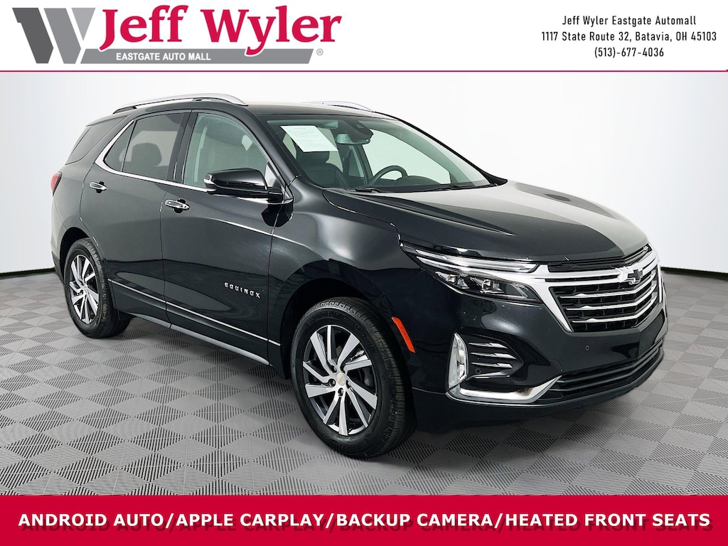 Jeff Wyler Eastgate Auto Mall is proud to offer this gorgeous 2024 Chevrolet Equinox Premier in Mosaic Black Metallic. Well equipped with: Preferred Equipment Group 1LZ, 18" Aluminum Wheels, 2 Rear USB Charging-Only Ports, 2-Way Power Driver Lumbar Control Seat Adjuster, 3.87 Final Drive Axle Ratio, 4-Wheel Disc Brakes, 6 Speakers, 6-Speaker Audio System Feature, ABS brakes, Air Conditioning, Alloy wheels, AM/FM radio: SiriusXM, Auto High-beam Headlights, Auto-dimming door mirrors, Auto-dimming Rear-View mirror, Automatic temperature control, Bluetooth® For Phone, Brake assist, Bumpers: body-color, Compass, Delay-off headlights, Driver 8-Way Power Seat Adjuster, Driver door bin, Driver vanity mirror, Dual front impact airbags, Dual front side impact airbags, Electronic Stability Control, Emergency communication system: OnStar and Chevrolet connected services capable, Four wheel independent suspension, Front & Rear Black Bowtie Emblems (LPO), Front anti-roll bar, Front Bucket Seats, Front Center Armrest, Front dual zone A/C, Front fog lights, Front Passenger 4-Way Manual Seat Adjuster, Front reading lights, Fully automatic headlights, Garage door transmitter, Heated door mirrors, Heated Driver & Front Passenger Seats, Heated front seats, Heated steering wheel, Illuminated entry, Low tire pressure warning, Memory seat, Occupant sensing airbag, Outside temperature display, Overhead airbag, Overhead console, Panic alarm, Passenger door bin, Passenger vanity mirror, Perforated Leather-Appointed Seat Trim, Power door mirrors, Power driver seat, Power Liftgate, Power steering, Power windows, Premium audio system: Chevrolet Infotainment 3 Plus, Radio data system, Radio: Chevrolet Infotainment 3 Plus System, Rear anti-roll bar, Rear reading lights, Rear seat center armrest, Rear window defroster, Rear window wiper, Remote keyless entry, Roof rack: rails only, Security system, SiriusXM, Speed control, Speed-sensing steering, Split folding rear seat, Spoiler, Steering wheel mounted audio controls, Tachometer, Telescoping steering wheel, Tilt steering wheel, Traction control, Trip computer, Turn signal indicator mirrors, and Variably intermittent wipers. CARFAX One-Owner. Clean CARFAX. Ask about available certifications. Used vehicles 10 years of age or newer with less than 100,000 miles are eligible for the Wyler Assurance Program, but eligible vehicles must pass our reconditioning process and multi-point inspection. Provided the vehicle passes inspection, vehicles will be eligible for the 6 month/6,000 mile limited warranty. The 6 month/6,000 mile limited warranty is NOT available on AS-IS vehicles, wholesale vehicles, lease buyback/pass-thru vehicles or un-inspected vehicles. Note that this program can also apply to vehicles where the remaining factory coverage is less than 6 months or 6,000 miles. Please check the Federal Trade Commission (FTC) Buyers guide on the vehicle for full details as to whether or not warranty coverage may apply. Contact Dealer for additional details. The Wyler Assurance 6 month/6,000 Mile limited warranty ends 6 months from the date of the Retail Purchase Agreement (BUYERS ORDER) or when the vehicle's odometer registers 6,000 additional miles to the mileage listed on the BUYERS ORDER, whichever comes first. Your Deductible - The warranty holder on your contract pays the first $100 of each covered repair.