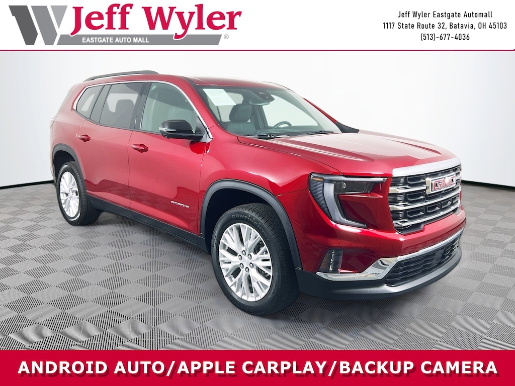 Jeff Wyler Eastgate Auto Mall is excited to offer this great-looking 2024 GMC Acadia Elevation in Volcanic Red Tintcoat. Well equipped with: Luxury Package (8" Diagonal Head-Up Display, Heated Rear Outboard Seating Positions, Heated Wiper Park, and Laminated Acoustic Glass), Preferred Equipment Group 4SC, Trailering Package (220 Amp Alternator, Heavy-Duty Cooling System, Hitch View, and Trailering Assist Guideline Hitch Guidance), 12 Speakers, 3.49 Final Drive Axle Ratio, 3rd row seats: split-bench, 4-Wheel Disc Brakes, 6-Way Power Front Passenger Seat Adjuster, 7-Passenger Seating (2-2-3 Seating Configuration), 8-Way Power Driver Seat Adjuster, ABS brakes, Air Conditioning, Alloy wheels, AM/FM radio: SiriusXM with 360L, Apple CarPlay/Android Auto, Auto High-beam Headlights, Auto-dimming Rear-View mirror, Automatic temperature control, Bodyside moldings, Bose Performance 12-Speaker System w/Sub-woofer, Brake assist, Bumpers: body-color, Compass, CoreTec Seat Trim, Delay-off headlights, Driver 4-Way Power Lumbar Seat Adjuster, Driver door bin, Driver vanity mirror, Dual front impact airbags, Dual front side impact airbags, Electronic Stability Control, Emergency communication system: OnStar and GMC connected services capable, Exterior Parking Camera Rear, Four wheel independent suspension, Front anti-roll bar, Front Bucket Seats, Front Center Armrest, Front dual zone A/C, Front fog lights, Front Passenger 4-Way Power Lumbar Seat Adjuster, Front reading lights, Fully automatic headlights, Garage door transmitter, Heated door mirrors, Heated Driver & Front Passenger Seats, Heated front seats, Heated steering wheel, Illuminated entry, Leather steering wheel, Low tire pressure warning, Navigation System, Not Equipped w/Heated Wiper Park, Occupant sensing airbag, Outside temperature display, Overhead airbag, Overhead console, Panic alarm, Passenger door bin, Passenger vanity mirror, Power door mirrors, Power driver seat, Power Liftgate, Power passenger seat, Power steering, Power windows, Radio data system, Radio: 15" Premium GMC Infotainment System, Rear air conditioning, Rear anti-roll bar, Rear reading lights, Rear side impact airbag, Rear window defroster, Rear window wiper, Remote keyless entry, Security system, SiriusXM w/360L, Speed control, Speed-sensing steering, Split folding rear seat, Spoiler, Sport steering wheel, Steering wheel mounted audio controls, Tachometer, Telescoping steering wheel, Tilt steering wheel, Traction control, Trip computer, Turn signal indicator mirrors, Variably intermittent wipers, Voltmeter, and Wheels: 20" x 8" Bright Silver Aluminum. CARFAX One-Owner. Clean CARFAX. Ask about available certifications. Used vehicles 10 years of age or newer with less than 100,000 miles are eligible for the Wyler Assurance Program, but eligible vehicles must pass our reconditioning process and multi-point inspection. Provided the vehicle passes inspection, vehicles will be eligible for the 6 month/6,000 mile limited warranty. The 6 month/6,000 mile limited warranty is NOT available on AS-IS vehicles, wholesale vehicles, lease buyback/pass-thru vehicles or un-inspected vehicles. Note that this program can also apply to vehicles where the remaining factory coverage is less than 6 months or 6,000 miles. Please check the Federal Trade Commission (FTC) Buyers guide on the vehicle for full details as to whether or not warranty coverage may apply. Contact Dealer for additional details. The Wyler Assurance 6 month/6,000 Mile limited warranty ends 6 months from the date of the Retail Purchase Agreement (BUYERS ORDER) or when the vehicle's odometer registers 6,000 additional miles to the mileage listed on the BUYERS ORDER, whichever comes first. Your Deductible - The warranty holder on your contract pays the first $100 of each covered repair.