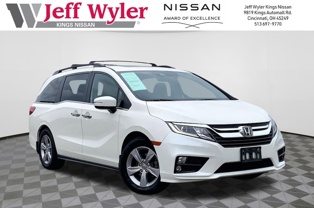 Jeff Wyler Kings Nissan is pumped up to offer this great 2019 Honda Odyssey EX-L in White. Well equipped with: 3rd row seats: split-bench, 4-Wheel Disc Brakes, 4.33 Axle Ratio, 7 Speakers, A/V remote: CabinControl, ABS brakes, Air Conditioning, Alloy wheels, AM/FM radio: SiriusXM, Anti-whiplash front head restraints, Apple CarPlay/Android Auto, Auto High-beam Headlights, Auto-dimming Rear-View mirror, Automatic temperature control, Blind Spot Information (BSI) System warning, Brake assist, Bumpers: body-color, Delay-off headlights, Driver door bin, Driver vanity mirror, Driver's Seat Mounted Armrest, Dual front impact airbags, Dual front side impact airbags, Electronic Stability Control, Emergency communication system: HondaLink, Exterior Parking Camera Rear, Forward collision: Collision Mitigation Braking System (CMBS) + FCW mitigation, Four wheel independent suspension, Front anti-roll bar, Front Bucket Seats, Front dual zone A/C, Front fog lights, Front reading lights, Fully automatic headlights, Garage door transmitter: HomeLink, Heated door mirrors, Heated Front Bucket Seats, Heated front seats, Illuminated entry, Knee airbag, Lane departure: Lane Keeping Assist System (LKAS) active, Leather Seat Trim, Leather steering wheel, Low tire pressure warning, Memory seat, Occupant sensing airbag, Outside temperature display, Overhead airbag, Overhead console, Panic alarm, Passenger door bin, Passenger seat mounted armrest, Passenger vanity mirror, Power door mirrors, Power driver seat, Power Liftgate, Power moonroof, Power passenger seat, Power steering, Power windows, Radio data system, Radio: 160-Watt AM/FM/HD/SiriusXM Audio System, Rear air conditioning, Rear anti-roll bar, Rear reading lights, Rear seat center armrest, Rear window defroster, Rear window wiper, Reclining 3rd row seat, Remote keyless entry, Security system, Speed control, Speed-sensing steering, Speed-Sensitive Wipers, Split folding rear seat, Spoiler, Steering wheel mounted audio controls, Tachometer, Telescoping steering wheel, Tilt steering wheel, Traction control, Trip computer, Turn signal indicator mirrors, Variably intermittent wipers, and Wheels: 18" Dark Silver-Painted Alloy.Ask about available certifications.