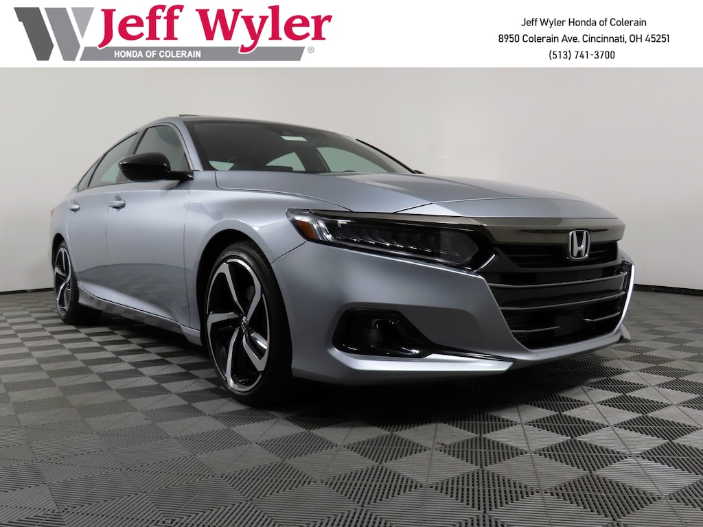 Jeff Wyler Honda of Colerain is delighted to offer this terrific 2021 Honda Accord Sport 2.0T in Lunar Silver Metallic. Well equipped with: 4-Wheel Disc Brakes, 8 Speakers, ABS brakes, Adaptive Cruise Control: Adaptive Cruise Control (ACC) with Low-Speed Follow, Air Conditioning, Alloy wheels, AM/FM radio: SiriusXM, Apple CarPlay/Android Auto, Auto High-beam Headlights, Automatic temperature control, Blind Spot Information (BSI) System warning, Brake assist, Bumpers: body-color, Cloth Seat Trim, Delay-off headlights, Driver door bin, Driver vanity mirror, Dual front impact airbags, Dual front side impact airbags, Electronic Stability Control, Emergency communication system: HondaLink, Exterior Parking Camera Rear, Forward collision: Collision Mitigation Braking System (CMBS) + FCW mitigation, Four wheel independent suspension, Front anti-roll bar, Front Bucket Seats, Front Center Armrest, Front dual zone A/C, Front fog lights, Front reading lights, Fully automatic headlights, Heated door mirrors, Heated Front Bucket Seats, Heated front seats, Illuminated entry, Knee airbag, Lane Departure Warning System, Leather steering wheel, Low tire pressure warning, Occupant sensing airbag, Outside temperature display, Overhead airbag, Overhead console, Panic alarm, Passenger door bin, Passenger vanity mirror, Power door mirrors, Power driver seat, Power moonroof, Power steering, Power windows, Radio data system, Radio: 180-Watt AM/FM/HD/SiriusXM Audio System, Rear anti-roll bar, Rear seat center armrest, Rear window defroster, Remote keyless entry, Security system, Speed control, Speed-sensing steering, Speed-Sensitive Wipers, Split folding rear seat, Spoiler, Steering wheel mounted audio controls, Tachometer, Telescoping steering wheel, Tilt steering wheel, Traction control, Trip computer, Variably intermittent wipers, and Wheels: 19" Machine-Finished Alloy w/Black Inserts.