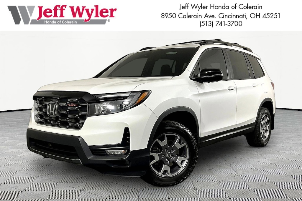 Jeff Wyler Honda of Colerain is delighted to offer this fantastic 2023 Honda Passport TrailSport in White. Well equipped with: 4-Wheel Disc Brakes, 4.334 Axle Ratio, 7 Speakers, A/V remote: CabinControl, ABS brakes, Air Conditioning, Alloy wheels, AM/FM radio: SiriusXM, Apple CarPlay/Android Auto, Auto High-beam Headlights, Auto-dimming Rear-View mirror, Automatic temperature control, Blind Spot Information (BSI) System warning, Brake assist, Bumpers: body-color, Compass, Delay-off headlights, Driver door bin, Driver vanity mirror, Driver's Seat Mounted Armrest, Dual front impact airbags, Dual front side impact airbags, Electronic Stability Control, Emergency communication system: HondaLink Assist, Exterior Parking Camera Rear, Four wheel independent suspension, Front anti-roll bar, Front Bucket Seats, Front Center Armrest, Front dual zone A/C, Front fog lights, Front reading lights, Fully automatic headlights, Garage door transmitter: HomeLink, Heated door mirrors, Heated Front Bucket Seats, Heated front seats, Illuminated entry, Lane departure: Lane Keeping Assist System (LKAS) active, Leather-Trimmed Seats, Low tire pressure warning, Navigation system: Honda Satellite-Linked Navigation System, Occupant sensing airbag, Outside temperature display, Overhead airbag, Overhead console, Panic alarm, Passenger door bin, Passenger seat mounted armrest, Passenger vanity mirror, Power door mirrors, Power driver seat, Power Liftgate, Power moonroof, Power passenger seat, Power steering, Power windows, Radio data system, Radio: 215-Watt Audio System w/7 Speakers, Rear air conditioning, Rear anti-roll bar, Rear reading lights, Rear seat center armrest, Rear window defroster, Rear window wiper, Remote keyless entry, Roof rack: rails only, Security system, Speed control, Speed-sensing steering, Split folding rear seat, Spoiler, Steering wheel mounted audio controls, Tachometer, Telescoping steering wheel, Tilt steering wheel, Traction control, Trip computer, Turn signal indicator mirrors, Variably intermittent wipers, and Wheels: 18" Machine-Finish Alloy.