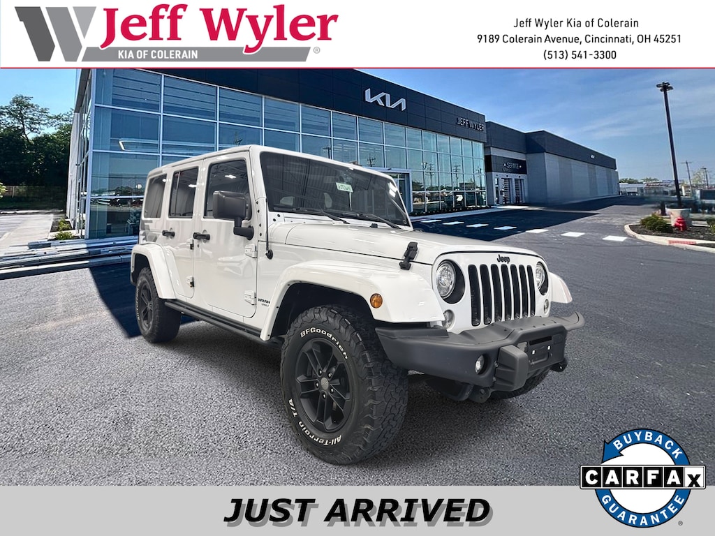 Jeff Wyler Kia of Colerain is delighted to offer this handsome 2017 Jeep Wrangler Unlimited Sahara in Bright White Clearcoat. Connectivity Group (Remote USB Port, Tire Pressure Monitoring Display, Uconnect Voice Command w/Bluetooth, and Vehicle Information Center), Quick Order Package 24T Winter (DISC) (Alpine 9-Speaker w/All Weather Subwoofer, Anti-Spin Differential Rear Axle, BF Goodrich Brand Tires, Black 3-Piece Hard Top, Black Fuel Filler Door, Black Jeep Grille Badge, Body Color Grille w/Black Accent, Delete Sahara Badge, Delete Sunrider Soft Top, Diesel Gray Interior Accents, Driver Height Adjuster Seat, Freedom Panel Storage Bag, Front Seat Back Map Pockets, Heated Front Seats, Leather Seat w/Cloth (Sport Mesh) (DISC), Low Gloss Black Wrangler Decal, MOPAR Black Tail Lamp Guards, MOPAR Coat Hooks & Grab Handles, MOPAR HD Rear Bumper, MOPAR Slush Mats, MOPAR Winch-Capable HD Front Bumper, Piano Black Interior Accents, Rear Window Defroster, Rear Window Wiper/Washer, Remote Start System, and Wheels: 17" x 7.5" Sport 5-Spoke Black (DISC)), Winter Edition Package, Winter Package Decals, 18" x 7.5" Polished Satin Carbon Wheels, 3.21 Rear Axle Ratio, 4-Wheel Disc Brakes, 40GB Hard Drive w/28GB Available, 5-Year SiriusXM Travel Link Service, 6.5" Touchscreen Display, 8 Speakers, ABS brakes, Air Conditioning, Alloy wheels, AM/FM radio: SiriusXM, Audio Jack Input for Mobile Devices, Auto-dimming Rear-View mirror, Body Color 3-Piece Hard Top, Brake assist, CD player, Cloth Seats w/Adjustable Head Restraints, Compass, Driver door bin, Driver vanity mirror, Dual front impact airbags, Electronic Stability Control, Freedom Top Hard Top Headliner, Front anti-roll bar, Front Bucket Seats, Front Center Armrest w/Storage, Front fog lights, Front reading lights, Fully automatic headlights, GPS Navigation, Heated door mirrors, Heavy Duty Suspension w/Gas Shocks (DISC), Illuminated entry, Integrated roll-over protection, Leather steering wheel, Low tire pressure warning, Manufacturer's Statement of Origin, Occupant sensing airbag, Outside temperature display, Panic alarm, Passenger door bin, Passenger vanity mirror, Power door mirrors, Power steering, Power windows, Radio data system, Radio: 130, Radio: 430 Nav, Rear anti-roll bar, Remote keyless entry, Security system, SiriusXM Travel Link, Speed control, Split folding rear seat, Steering wheel mounted audio controls, Supplemental Front Seat Side Airbags, Tachometer, Tilt steering wheel, Traction control, Trip computer, and Variably intermittent wipers Our PRE-OWNED vehicles are put through a rigorous 167- POINT QUALITY ASSURANCE INSPECTION along with an average amount of over $1,400.00 SPENT to recondition each vehicle so we can be sure to deliver you the highest quality vehicle like you deserve! ***ONLINE PRICE DOES NOT INCLUDE WYLER FAMILY FIRST PACKAGE***