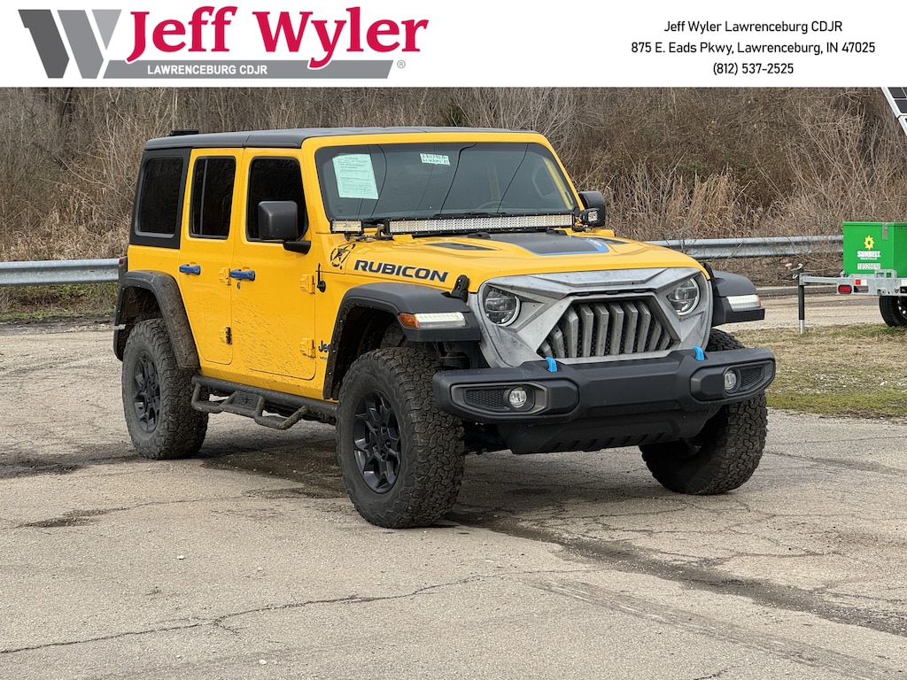 Jeff Wyler Chrysler Dodge Jeep of Lawrenceburg is delighted to offer this good-looking and fun 2021 Jeep Wrangler Unlimited Rubicon 4xe in Baja Yellow Clearcoat. Cold Weather Group (Heated Front Seats, Heated Steering Wheel, and Remote Start System), Quick Order Package 29V, Trailer Tow & HD Electrical Group (7 & 4 Pin Wiring Harness, 700 Amp Maintenance Free Battery, Auxiliary Switches, and Class II Receiver Hitch), 2.0L I4 DOHC, 4-Wheel Disc Brakes, 4.10 Rear Axle Ratio, 9 Speakers, ABS brakes, Air Conditioning, Alloy wheels, AM/FM radio: SiriusXM, Apple CarPlay/Android Auto, Auto-dimming Rear-View mirror, Automatic temperature control, Black 3-Piece Hard Top, Brake assist, Compass, Delay-off headlights, Driver door bin, Driver vanity mirror, Dual front impact airbags, Dual front side impact airbags, Electronic Stability Control, Emergency communication system: SiriusXM Guardian, Freedom Panel Storage Bag, Front anti-roll bar, Front Bucket Seats, Front Center Armrest w/Storage, Front dual zone A/C, Front fog lights, Front reading lights, Fully automatic headlights, Garage door transmitter, Heated door mirrors, Illuminated entry, Integrated roll-over protection, Leather steering wheel, Low tire pressure warning, MOPAR All-Weather Floor Mats (DISC), MOPAR Grab Handle Kit, MOPAR Satin Black Grille, Navigation System, No Soft Top, Occupant sensing airbag, Outside temperature display, Panic alarm, ParkView Rear Back-Up Camera, Passenger door bin, Passenger vanity mirror, Performance Suspension, Power door mirrors, Power steering, Power windows, Premium Cloth Low-Back Bucket Seats, Radio data system, Radio: Uconnect 4C Nav w/8.4" Display, Rear anti-roll bar, Rear reading lights, Rear Window Defroster, Rear Window Wiper/Washer, Remote keyless entry, Remote Proximity Keyless Entry, Security system, Speed control, Split folding rear seat, Steering wheel mounted audio controls, Tachometer, Telescoping steering wheel, Tilt steering wheel, Traction control, Trip computer, Variably intermittent wipers, Voltmeter, and Wheels: 17" x 7.5" Machined/Painted Black Our PRE-OWNED vehicles are put through a rigorous 167- POINT QUALITY ASSURANCE INSPECTION along with an average amount of over $1,400.00 SPENT to recondition each vehicle so we can be sure to deliver you the highest quality vehicle like you deserve! ***ONLINE PRICE DOES NOT INCLUDE WYLER FAMILY FIRST PACKAGE*** Stop by 4136 Shelbyville Road to see for yourself, or give us a call @ 502-897-3151 to schedule your test drive! Ask about available certifications.