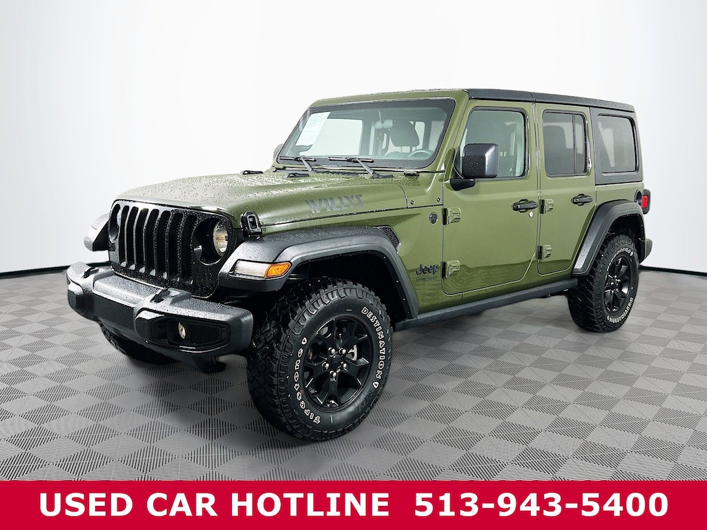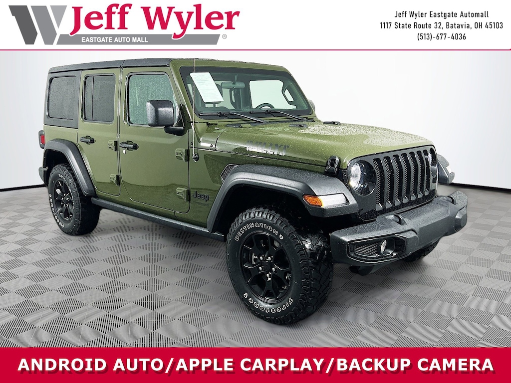 Jeff Wyler Eastgate Auto Mall is pleased to offer this fantastic 2021 Jeep Wrangler Unlimited Willys in Sarge Green Clearcoat. Well equipped with: Quick Order Package 23K Willys Sport (4-Wheel Drive Swing Gate Decal, Anti-Spin Differential Rear Axle, Black Grille, Black Trail Rated Badge, Deep Tint Sunscreen Windows, Matte Black Jeep Badge, Mold In Color Bumper w/Gloss Black, Wheels: 17" x 7.5" Moab Black Aluminum, Willys, Willys Hood Decal, and Wrangler Decal), Trailer Tow & HD Electrical Group (240 Amp Alternator, 7 & 4 Pin Wiring Harness, 700 Amp Maintenance Free Battery, Auxiliary Switches, and Class II Receiver Hitch), 3.45 Rear Axle Ratio, 4-Wheel Disc Brakes, 8 Speakers, ABS brakes, Air Conditioning, AM/FM radio, Aux Battery, Black 3-Piece Hard Top, Brake assist, Cloth Low-Back Bucket Seats, Compass, Delay-off headlights, Driver door bin, Driver vanity mirror, Dual front impact airbags, Dual front side impact airbags, Electronic Stability Control, For More Info, Call 800-643-2112, Freedom Panel Storage Bag, Front anti-roll bar, Front Bucket Seats, Front Center Armrest w/Storage, Front fog lights, Front reading lights, Integrated roll-over protection, Low tire pressure warning, MOPAR All-Weather Floor Mats (DISC), No Soft Top, Non-Lock Fuel Cap w/o Discriminator, Normal Duty Suspension, Occupant sensing airbag, Outside temperature display, ParkView Rear Back-Up Camera, Passenger door bin, Passenger vanity mirror, Power steering, Radio data system, Radio: Uconnect 3 w/5" Display, Rear anti-roll bar, Rear reading lights, Rear Window Defroster, Rear Window Wiper/Washer, SiriusXM Radio Service, SiriusXM Satellite Radio, Speed control, Split folding rear seat, Steering wheel mounted audio controls, Stop-Start Dual Battery System, Tachometer, Telescoping steering wheel, Tilt steering wheel, Traction control, Trip computer, Variably intermittent wipers, and Wheels: 17" x 7.5" Black Steel Styled. CARFAX One-Owner. Ask about available certifications. Used vehicles 10 years of age or newer with less than 100,000 miles are eligible for the Wyler Assurance Program, but eligible vehicles must pass our reconditioning process and multi-point inspection. Provided the vehicle passes inspection, vehicles will be eligible for the 6 month/6,000 mile limited warranty. The 6 month/6,000 mile limited warranty is NOT available on AS-IS vehicles, wholesale vehicles, lease buyback/pass-thru vehicles or un-inspected vehicles. Note that this program can also apply to vehicles where the remaining factory coverage is less than 6 months or 6,000 miles. Please check the Federal Trade Commission (FTC) Buyers guide on the vehicle for full details as to whether or not warranty coverage may apply. Contact Dealer for additional details. The Wyler Assurance 6 month/6,000 Mile limited warranty ends 6 months from the date of the Retail Purchase Agreement (BUYERS ORDER) or when the vehicle's odometer registers 6,000 additional miles to the mileage listed on the BUYERS ORDER, whichever comes first. Your Deductible - The warranty holder on your contract pays the first $100 of each covered repair.