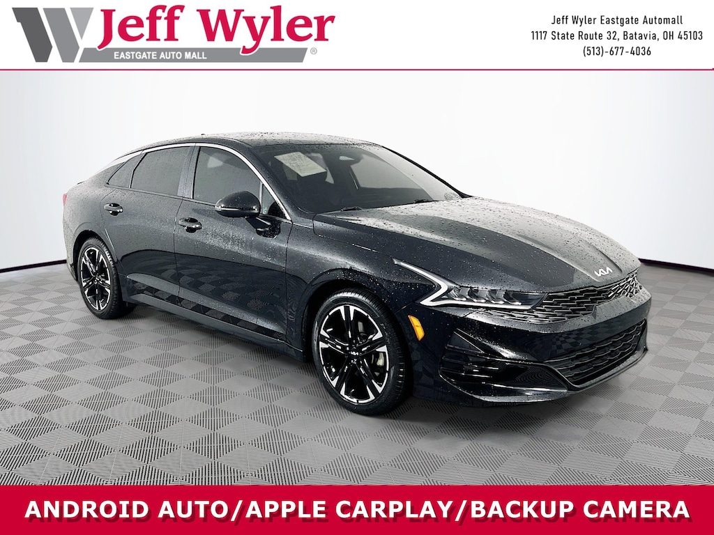 Jeff Wyler Eastgate Auto Mall is honored to offer this outstanding 2022 Kia K5 GT-Line in Ebony Black. Well equipped with: 4-Wheel Disc Brakes, 6 Speakers, ABS brakes, Air Conditioning, Alloy wheels, AM/FM radio: SiriusXM, Apple CarPlay & Android Auto, Auto High-beam Headlights, Automatic temperature control, Brake assist, Bumpers: body-color, Carpeted Floor Mats, Cloth/Leatherette Seat Trim, Delay-off headlights, Driver door bin, Driver vanity mirror, Dual front impact airbags, Dual front side impact airbags, Electronic Stability Control, Four wheel independent suspension, Front anti-roll bar, Front Bucket Seats, Front Center Armrest, Front dual zone A/C, Front fog lights, Front reading lights, Fully automatic headlights, Heated door mirrors, Heated Front Bucket Seats, Heated front seats, Illuminated entry, Knee airbag, Low tire pressure warning, Navigation System, Occupant sensing airbag, Outside temperature display, Overhead airbag, Overhead console, Panic alarm, Passenger door bin, Passenger vanity mirror, Power door mirrors, Power driver seat, Power steering, Power windows, Radio data system, Radio: AM/FM/MP3 Audio System, Rear anti-roll bar, Rear seat center armrest, Rear side impact airbag, Rear window defroster, Remote keyless entry, Security system, Speed control, Speed-sensing steering, Split folding rear seat, Spoiler, Sport steering wheel, Steering wheel mounted audio controls, Tachometer, Telescoping steering wheel, Tilt steering wheel, Traction control, Trip computer, Turn signal indicator mirrors, Variably intermittent wipers, and Wheels: 7.5J x 18" Gloss Black Machined Finish Alloy. Ask about available certifications. Used vehicles 10 years of age or newer with less than 100,000 miles are eligible for the Wyler Assurance Program, but eligible vehicles must pass our reconditioning process and multi-point inspection. Provided the vehicle passes inspection, vehicles will be eligible for the 6 month/6,000 mile limited warranty. The 6 month/6,000 mile limited warranty is NOT available on AS-IS vehicles, wholesale vehicles, lease buyback/pass-thru vehicles or un-inspected vehicles. Note that this program can also apply to vehicles where the remaining factory coverage is less than 6 months or 6,000 miles. Please check the Federal Trade Commission (FTC) Buyers guide on the vehicle for full details as to whether or not warranty coverage may apply. Contact Dealer for additional details. The Wyler Assurance 6 month/6,000 Mile limited warranty ends 6 months from the date of the Retail Purchase Agreement (BUYERS ORDER) or when the vehicle's odometer registers 6,000 additional miles to the mileage listed on the BUYERS ORDER, whichever comes first. Your Deductible - The warranty holder on your contract pays the first $100 of each covered repair.