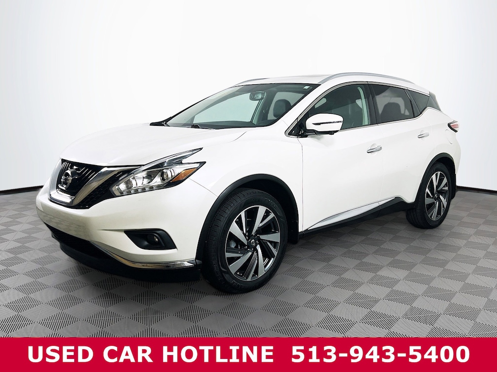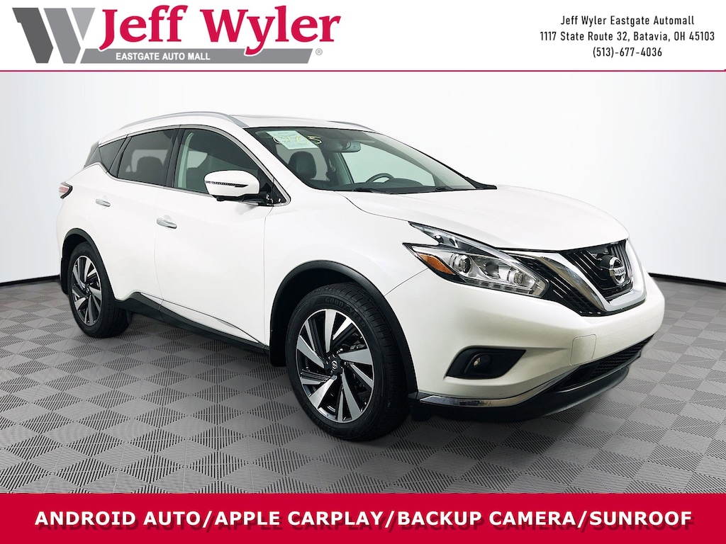Jeff Wyler Eastgate Auto Mall is honored to offer this gorgeous-looking 2017 Nissan Murano Platinum in Pearl White. Well equipped with: Cargo Package (Cargo Area Protector, Cargo Net, and Retractable Cargo Cover), Platinum Technology Package (Intelligent Cruise Control and Predictive Forward Collision Warning (PFCW)), 11 Speakers, 4-Wheel Disc Brakes, 4.677 Axle Ratio, ABS brakes, Air Conditioning, Alloy wheels, AM/FM radio: SiriusXM, Anti-whiplash front head restraints, Auto-dimming Rear-View mirror, Automatic temperature control, Blind Spot Warning, Brake assist, Bumpers: body-color, Carpeted Floor Mats & Cargo Mat, CD player, Compass, Delay-off headlights, Driver door bin, Driver vanity mirror, Dual front impact airbags, Dual front side impact airbags, Electronic Stability Control, Emergency communication system: NissanConnect Services, Four wheel independent suspension, Front anti-roll bar, Front Bucket Seats, Front Center Armrest w/Storage, Front dual zone A/C, Front fog lights, Front reading lights, Fully automatic headlights, Garage door transmitter: HomeLink, Heated & Cooled Front Bucket Seats, Heated door mirrors, Heated front seats, Heated rear seats, Heated steering wheel, Illuminated entry, Knee airbag, Leather Shift Knob, Leather-Appointed Seat Trim, Low tire pressure warning, Memory seat, Navigation System, NissanConnect Services Powered By SiriusXM, Occupant sensing airbag, Outside temperature display, Overhead airbag, Overhead console, Panic alarm, Passenger door bin, Passenger vanity mirror, Power door mirrors, Power driver seat, Power Liftgate, Power passenger seat, Power steering, Power windows, Radio data system, Radio: AM/FM/CD Audio System w/Navigation, Rear anti-roll bar, Rear Bumper Protector, Rear reading lights, Rear seat center armrest, Rear window defroster, Rear window wiper, Remote keyless entry, Roof rack: rails only, Security system, Speed control, Speed-sensing steering, Speed-Sensitive Wipers, Splash Guards, Split folding rear seat, Spoiler, Steering wheel memory, Steering wheel mounted audio controls, Tachometer, Telescoping steering wheel, Tilt steering wheel, Traction control, Trip computer, Turn signal indicator mirrors, Variably intermittent wipers, Ventilated front seats, and Wheels: 20" Machined Aluminum-Alloy. Clean CARFAX. Ask about available certifications. Used vehicles 10 years of age or newer with less than 100,000 miles are eligible for the Wyler Assurance Program, but eligible vehicles must pass our reconditioning process and multi-point inspection. Provided the vehicle passes inspection, vehicles will be eligible for the 6 month/6,000 mile limited warranty. The 6 month/6,000 mile limited warranty is NOT available on AS-IS vehicles, wholesale vehicles, lease buyback/pass-thru vehicles or un-inspected vehicles. Note that this program can also apply to vehicles where the remaining factory coverage is less than 6 months or 6,000 miles. Please check the Federal Trade Commission (FTC) Buyers guide on the vehicle for full details as to whether or not warranty coverage may apply. Contact Dealer for additional details. The Wyler Assurance 6 month/6,000 Mile limited warranty ends 6 months from the date of the Retail Purchase Agreement (BUYERS ORDER) or when the vehicle's odometer registers 6,000 additional miles to the mileage listed on the BUYERS ORDER, whichever comes first. Your Deductible - The warranty holder on your contract pays the first $100 of each covered repair.