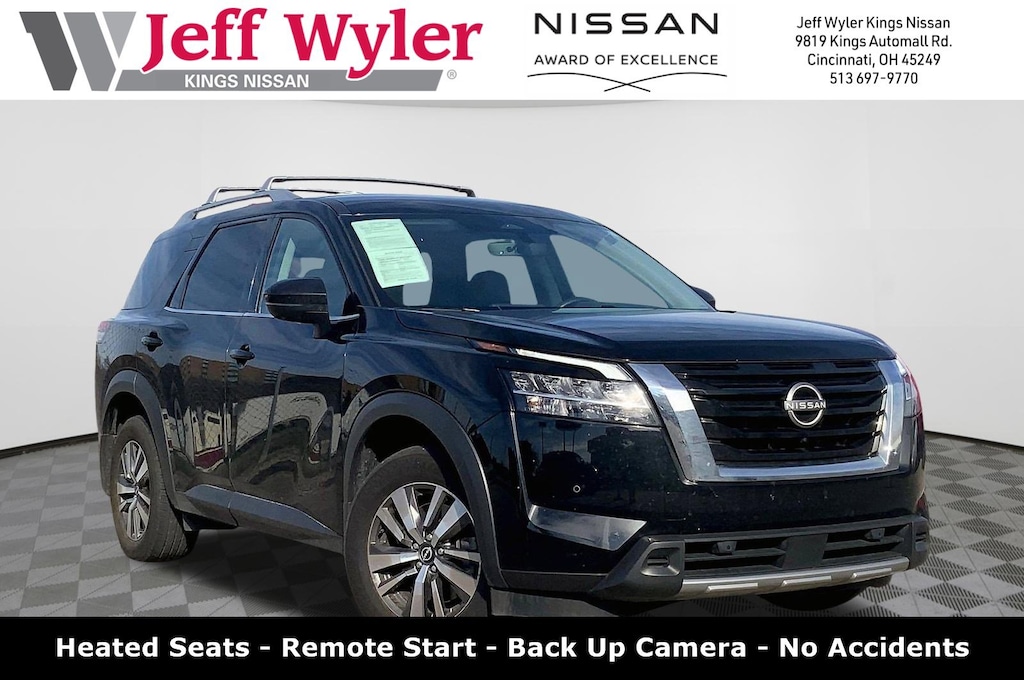 Jeff Wyler Kings Nissan is pumped up to offer this charming 2024 Nissan Pathfinder SL in Super Black. Well equipped with: 4WD, 3rd row seats: bench, 4-Wheel Disc Brakes, 6 Speakers, ABS brakes, Air Conditioning, Alloy wheels, AM/FM radio: SiriusXM, Auto High-beam Headlights, Auto-dimming Rear-View mirror, Automatic temperature control, Axle Ratio: 4.334, Bench Seat Carpeted Floor Mats (Set of 4), Black Splash Guards (Set of 4), Brake assist, Bumpers: body-color, Cross Bars, Delay-off headlights, Driver door bin, Driver vanity mirror, Dual front impact airbags, Dual front side impact airbags, Electronic Stability Control, Emergency communication system, Exterior Parking Camera Rear, Four wheel independent suspension, Front anti-roll bar, Front Bucket Seats, Front Center Armrest, Front dual zone A/C, Front reading lights, Fully automatic headlights, Garage door transmitter: HomeLink, Heated door mirrors, Heated Front Bucket Seats, Heated front seats, Heated steering wheel, Illuminated entry, Knee airbag, Leather steering wheel, Leather-Appointed Seating Surfaces, Low tire pressure warning, Navigation system: NissanConnect with Navigation and Services, NissanConnect featuring Apple CarPlay and Android Auto, NissanConnect w/Navigation & Services, Occupant sensing airbag, Outside temperature display, Overhead airbag, Overhead console, Panic alarm, Passenger door bin, Passenger vanity mirror, Power door mirrors, Power driver seat, Power Liftgate, Power passenger seat, Power steering, Power windows, Radio data system, Radio: AM/FM Audio System, Rear air conditioning, Rear anti-roll bar, Rear reading lights, Rear seat center armrest, Rear side impact airbag, Rear window defroster, Rear window wiper, Reclining 3rd row seat, Remote keyless entry, Security system, Speed control, Speed-sensing steering, Split folding rear seat, Spoiler, Steering wheel mounted audio controls, Tachometer, Telescoping steering wheel, Tilt steering wheel, Traction control, Trip computer, Turn signal indicator mirrors, Variably intermittent wipers, and Wheels: 18" x 8J Machined Alloy.Ask about available certifications.
