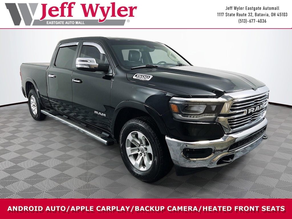 Jeff Wyler Eastgate Auto Mall is delighted to offer this beautiful-looking 2019 Ram 1500 Laramie in Diamond Black Crystal Pearlcoat. Well equipped with: Bed Utility Group (Spray In Bedliner), Laramie Level 1 Equipment Group (Single Disc Remote CD Player), Protection Group (Tow Hooks), Quick Order Package 27H Laramie, #1 Seat Foam Cushion, 10 Speakers, 3 Rear Seat Head Restraints, 3.21 Rear Axle Ratio, 33 Gallon Fuel Tank, 4 Way Front Headrests, 4-Wheel Disc Brakes, 48V Belt Starter Generator, 8.4" Touchscreen Display, ABS brakes, Adjustable pedals, Air Conditioning, Alloy wheels, AM/FM radio: SiriusXM, Apple CarPlay, Apple CarPlay/Android Auto, Audio memory, Auto-dimming door mirrors, Auto-dimming Rear-View mirror, Automatic temperature control, Brake assist, Bumpers: chrome, Compass, Delay-off headlights, Driver door bin, Driver Seat Memory, Driver vanity mirror, Dual front impact airbags, Dual front side impact airbags, Electronic Stability Control, Front & Rear Rubber Floor Mats, Front anti-roll bar, Front Center Armrest w/Storage, Front dual zone A/C, Front fog lights, Front reading lights, Front Seat Back Map Pockets, Front wheel independent suspension, Fully automatic headlights, Garage door transmitter, Google Android Auto, GPS Antenna Input, Heated door mirrors, Heated Front Seats, Heated front seats, Heated Steering Wheel, Heated steering wheel, Illuminated entry, Integrated Center Stack Radio, Leather steering wheel, Leather Trim 40/20/40 Bench Seat, Low tire pressure warning, Memory seat, Occupant sensing airbag, Outside temperature display, Overhead airbag, Overhead console, Panic alarm, ParkView Rear Back-Up Camera, Passenger door bin, Passenger vanity mirror, Pedal memory, Power 4-Way Driver Lumbar Adjust, Power 4-Way Passenger Lumbar Adjust, Power 8-Way Driver & Passenger Seats, Power door mirrors, Power driver seat, Power passenger seat, Power steering, Power windows, Radio data system, Radio: Uconnect 4 w/8.4" Display, Rear anti-roll bar, Rear seat center armrest, Rear step bumper, Rear Wheelhouse Liners, Rear window defroster, Remote keyless entry, Security system, SiriusXM Satellite Radio, Speed control, Split folding rear seat, Steering wheel mounted audio controls, Tachometer, Telescoping steering wheel, Tilt steering wheel, Traction control, Trip computer, Turn signal indicator mirrors, Variably intermittent wipers, Ventilated Front Seats, Ventilated front seats, Voltmeter, Wheel to Wheel Side Steps, and Wheels: 18" x 8" Aluminum Base Painted. Awards: * Motor Trend Automobiles of the year * 2019 KBB.com Best Auto Tech Awards * NACTOY 2019 North American Truck of the Year * 2019 KBB.com 10 Best Road Trip Cars * 2019 KBB.com 10 Favorite New-for-2019 Cars Ask about available certifications. Used vehicles 10 years of age or newer with less than 100,000 miles are eligible for the Wyler Assurance Program, but eligible vehicles must pass our reconditioning process and multi-point inspection. Provided the vehicle passes inspection, vehicles will be eligible for the 6 month/6,000 mile limited warranty. The 6 month/6,000 mile limited warranty is NOT available on AS-IS vehicles, wholesale vehicles, lease buyback/pass-thru vehicles or un-inspected vehicles. Note that this program can also apply to vehicles where the remaining factory coverage is less than 6 months or 6,000 miles. Please check the Federal Trade Commission (FTC) Buyers guide on the vehicle for full details as to whether or not warranty coverage may apply. Contact Dealer for additional details. The Wyler Assurance 6 month/6,000 Mile limited warranty ends 6 months from the date of the Retail Purchase Agreement (BUYERS ORDER) or when the vehicle's odometer registers 6,000 additional miles to the mileage listed on the BUYERS ORDER, whichever comes first. Your Deductible - The warranty holder on your contract pays the first $100 of each covered repair.
