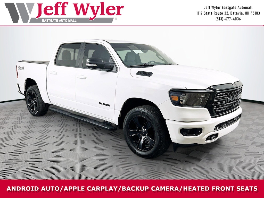 Jeff Wyler Eastgate Auto Mall is pumped up to offer this good-looking 2022 Ram 1500 Big Horn/Lone Star in Bright White Clearcoat. Well equipped with: Big Horn Level B Equipment Group (DISC) (115V Auxiliary Power Outlet, 115V Auxiliary Rear Power Outlet, 2nd Row In Floor Storage Bins, 400W Inverter, 4G LTE Wi-Fi Hot Spot, 8.4" Touchscreen Display, Air Conditioning ATC w/Dual Zone Control, Apple CarPlay, Auto-Dimming Exterior Driver Mirror, Auto-Dimming Rear-View Mirror, Black Premium Power Mirrors (GUL), Bluetooth Handsfree Phone & Audio, Class IV Receiver Hitch, Cluster 7.0" TFT Color Display, Connectivity - US/Canada, Exterior Mirrors Courtesy Lamps, Exterior Mirrors w/Supplemental Signals, Foam Bottle Insert (Door Trim Panel), For More Info, Call 800-643-2112, Glove Box Lamp, Google Android Auto, Heated Front Seats, Heated Steering Wheel, Integrated Center Stack Radio, Media Hub w/2 Charge Only USBs, ParkSense Front/Rear Park Assist w/Stop, Power 2-Way Driver Lumbar Adjust, Power 8-Way Driver Seat, Power Adjustable Pedals, Radio: Uconnect 5 W w/8.4" Display, Rear Dome w/On/Off Switch Lamp, Rear Power Sliding Window, Rear Window Defroster, Remote Start System, Security Alarm, SiriusXM Radio Service, SiriusXM Satellite Radio, Sun Visors w/Illuminated Vanity Mirrors, Universal Garage Door Opener, and USB Host Flip), Night Edition (DISC) (3 Rear Seat Head Restraints, 4 Way Front Headrests, Anti-Spin Differential Rear Axle, Black Exterior Truck Badging, Black Headlamp Bezels, Black Interior Accents, Body Color Front Bumper, Body Color Rear Bumper w/Step Pads, Bucket Seats, Delete LED Lamp - Floor Console Bin, Deluxe Cloth Bucket Seats, Dual Exhaust w/Black Tips, Front Seat Back Map Pockets, Full Length Floor Console, Manual Adjust 4-Way Front Passenger Seat, Rear 60/40 Folding Seat, Rear Center Armrest, and Wheels: 20" x 9.0" Premium Paint/Polished (DISC)), Quick Order Package 25Z Big Horn (Big Horn Badge), 3.21 Rear Axle Ratio, 4-Wheel Disc Brakes, 48V Belt Starter Generator, 6 Speakers, ABS brakes, Air Conditioning, Alloy wheels, AM/FM radio, Black Exterior Mirrors, Brake assist, Bumpers: chrome, Cloth Bench Seat, Compass, Convex Wide-Angle Mirror Insert, Delay-off headlights, Driver door bin, Dual front impact airbags, Dual front side impact airbags, Electronic Stability Control, Emergency communication system: SiriusXM Guardian, Front anti-roll bar, Front Center Armrest w/Storage, Front fog lights, Front License Plate Bracket, Front reading lights, Front wheel independent suspension, Fully automatic headlights, Global Telematics Box Module (TBM), GPS Antenna Input, Heated door mirrors, Heavy-Duty Engine Cooling, Illuminated entry, Integrated Voice Command w/Bluetooth, Leather steering wheel, Low tire pressure warning, Occupant sensing airbag, Outside temperature display, Overhead airbag, Overhead console, Panic alarm, ParkView Rear Back-Up Camera, Passenger door bin, Passenger vanity mirror, Power door mirrors, Power steering, Power windows, Radio data system, Radio: Uconnect 3 w/5" Display, Rear anti-roll bar, Rear seat center armrest, Rear step bumper, Rear Underseat Compartment Storage (DISC), Remote keyless entry, Speed control, Split folding rear seat, Steering wheel mounted audio controls, Tachometer, Telescoping steering wheel, Tilt steering wheel, Traction control, Trip computer, Variably intermittent wipers, Voltmeter, and Wheels: 18" x 8" Cast-Aluminum Painted. Clean CARFAX. Ask about available certifications. Used vehicles 10 years of age or newer with less than 100,000 miles are eligible for the Wyler Assurance Program, but eligible vehicles must pass our reconditioning process and multi-point inspection. Provided the vehicle passes inspection, vehicles will be eligible for the 6 month/6,000 mile limited warranty. The 6 month/6,000 mile limited warranty is NOT available on AS-IS vehicles, wholesale vehicles, lease buyback/pass-thru vehicles or un-inspected vehicles. Note that this program can also apply to vehicle