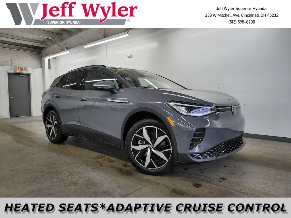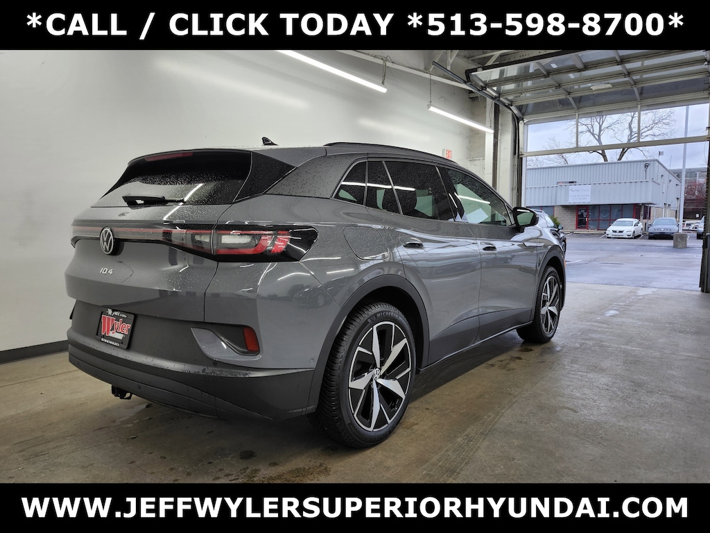 Jeff Wyler Superior Hyundai is honored to offer this great-looking 2023 Volkswagen ID.4 Pro S in . Well equipped with: ABS brakes, Active Cruise Control, Alloy wheels, Electronic Stability Control, Front dual zone A/C, Heated door mirrors, Heated Front Seats, Heated front seats, Illuminated entry, Low tire pressure warning, Navigation System, Power Liftgate, Remote keyless entry, Traction control, 3.90 Axle Ratio, 4 Wheel Independent Suspension, 7 Speakers, Air Conditioning, Auto High-beam Headlights, Auto-dimming Rear-View mirror, Automatic temperature control, Brake assist, Bumpers: body-color, Delay-off headlights, Driver door bin, Driver vanity mirror, Driver's Seat Mounted Armrest, Dual front impact airbags, Dual front side impact airbags, Emergency communication system: VW Car-Net Safe & Secure 5-year, Exterior Parking Camera Rear, Four wheel independent suspension, Front anti-roll bar, Front Bucket Seats, Front fog lights, Front reading lights, Fully automatic headlights, Heated steering wheel, Memory seat, Occupant sensing airbag, Outside temperature display, Overhead airbag, Overhead console, Panic alarm, Passenger door bin, Passenger seat mounted armrest, Passenger vanity mirror, Perforated V-Tex Leatherette Seating Surfaces, Power door mirrors, Power driver seat, Power passenger seat, Power steering, Power windows, Radio data system, Radio: Discover Pro Max w/12" Touchscreen Nav, Rain sensing wipers, Rear anti-roll bar, Rear reading lights, Rear seat center armrest, Rear window defroster, Rear window wiper, Speed control, Speed-sensing steering, Split folding rear seat, Spoiler, Steering wheel mounted audio controls, Telescoping steering wheel, Tilt steering wheel, Trip computer, Turn signal indicator mirrors, Variably intermittent wipers, and Wheels: 20" 5-Spoke 2-Tone Machined Alloy. CARFAX One-Owner. Clean CARFAX. This sales price excludes tax, title, and dealer fees. While every reasonable effort is made to ensure the accuracy of this information, we are not responsible for any errors or omissions contained on these pages. Used vehicles 10 years of age or newer with less than 100,000 miles are eligible for the Wyler Assurance Program, but eligible vehicles must pass our reconditioning process and multi-point inspection. Provided the vehicle passes inspection, vehicles will be eligible for the 6 month/6,000 mile limited warranty. The 6 month/6,000 mile limited warranty is NOT available on AS-IS vehicles, wholesale vehicles, lease buyback/pass-thru vehicles or un-inspected vehicles. Note that this program can also apply to vehicles where the remaining factory coverage is less than 6 months or 6,000 miles. Please check the Federal Trade Commission (FTC) Buyers guide on the vehicle for full details as to whether or not warranty coverage may apply. Contact Dealer for additional details. The Wyler Assurance 6 month/6,000 Mile limited warranty ends 6 months from the date of the Retail Purchase Agreement (BUYERS ORDER) or when the vehicle's odometer registers 6,000 additional miles to the mileage listed on the BUYERS ORDER, whichever comes first.Your Deductible - The warranty holder on your contract pays the first $100 of each covered repair.